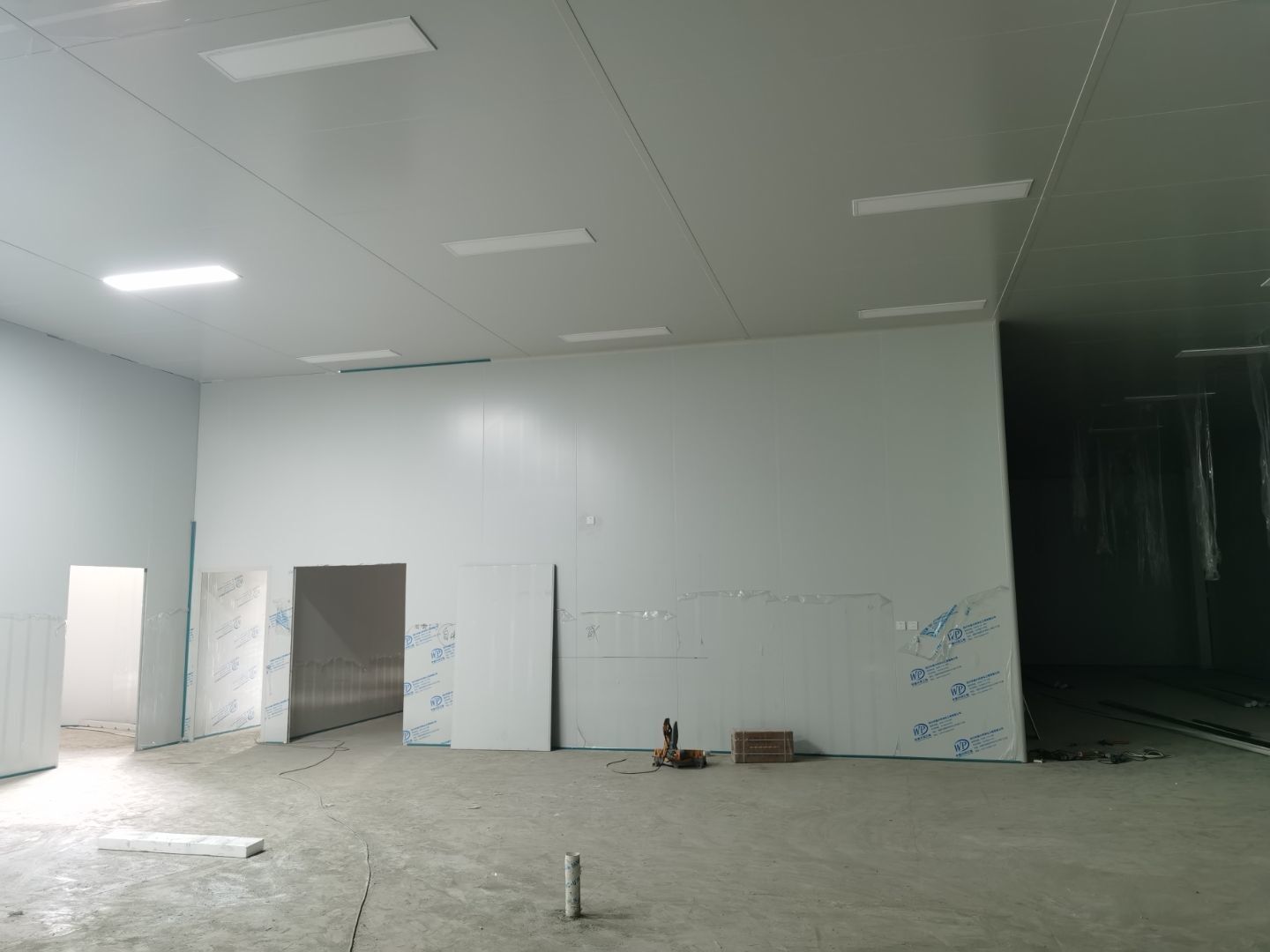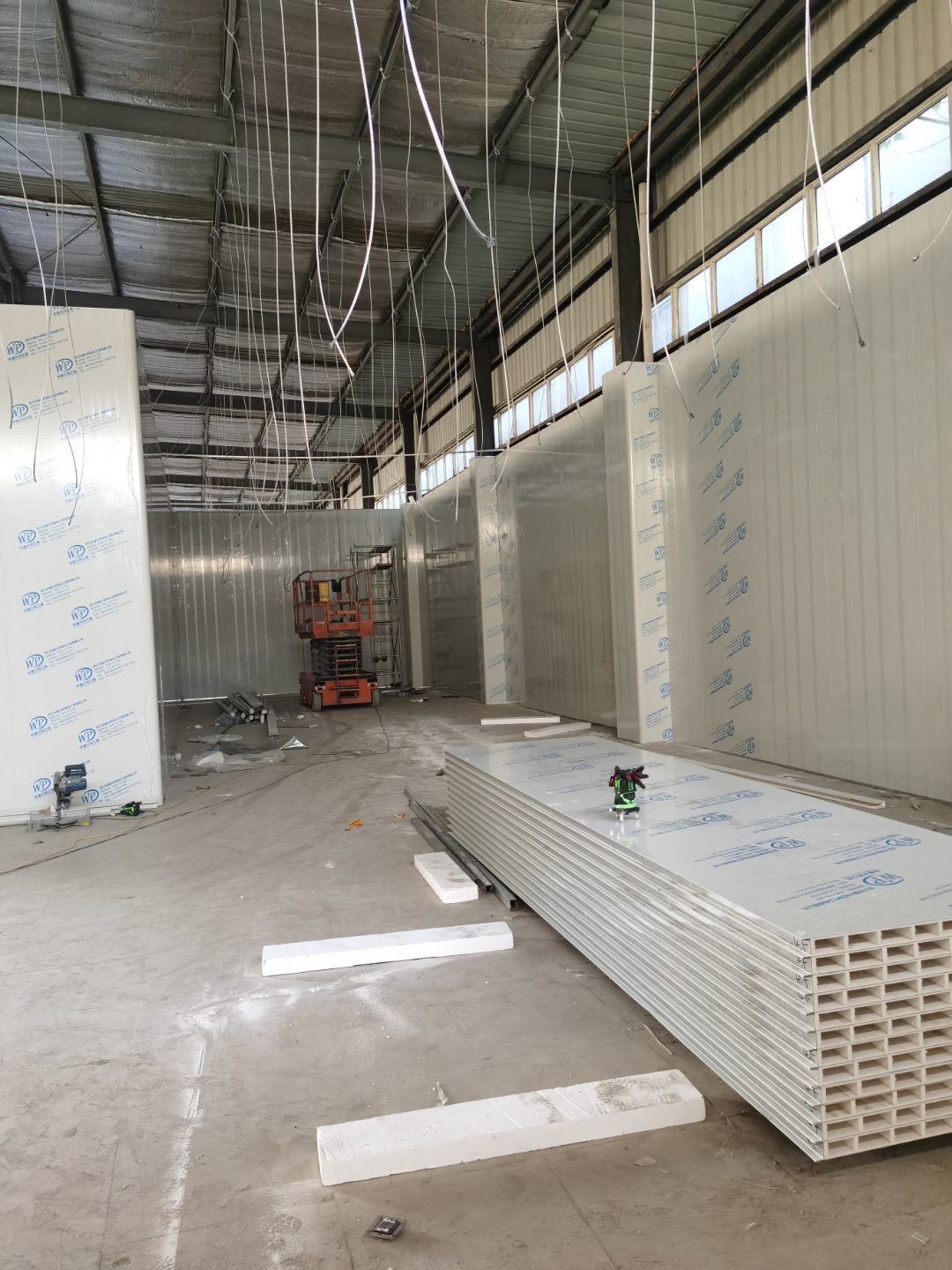 1,彩鋼墻板立板除預留設備外完成100% 2,彩鋼板吊頂除預留外,完成95% 3,三防板吊頂完成100% 4,水電安裝完成70% 5,彩鋼板收尾工作完成60% 6,聚氨酯超耐磨地坪漆,完成90%