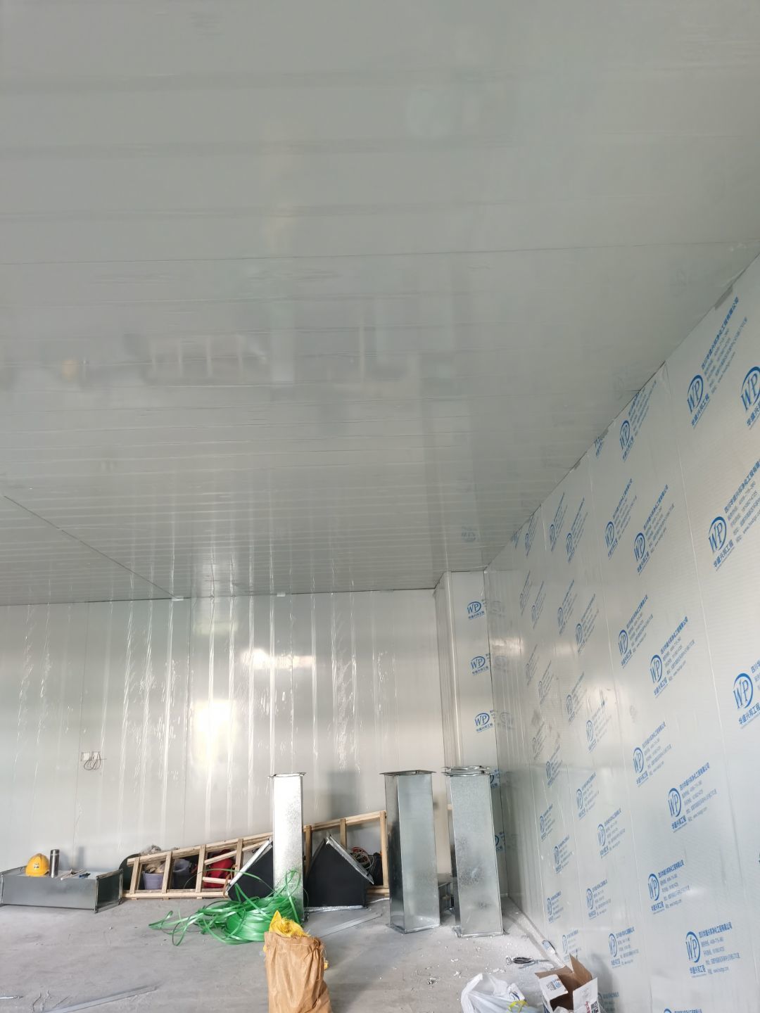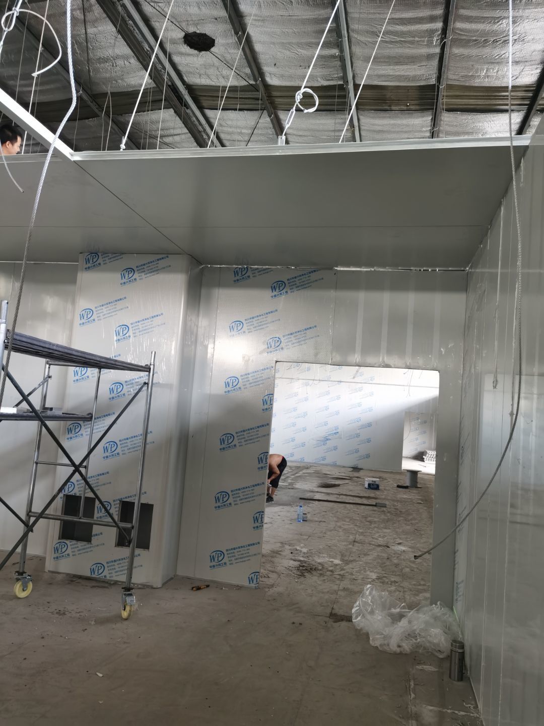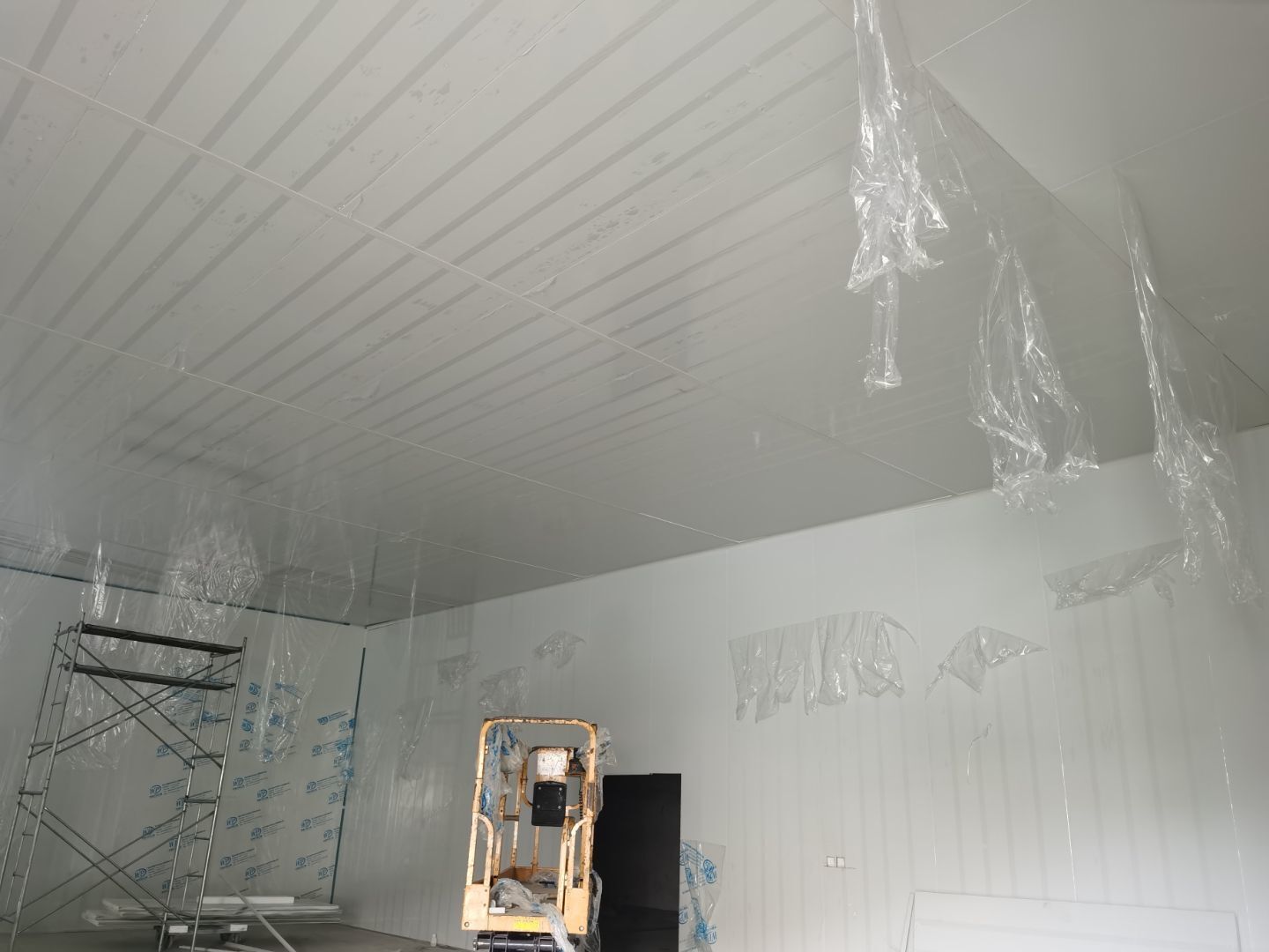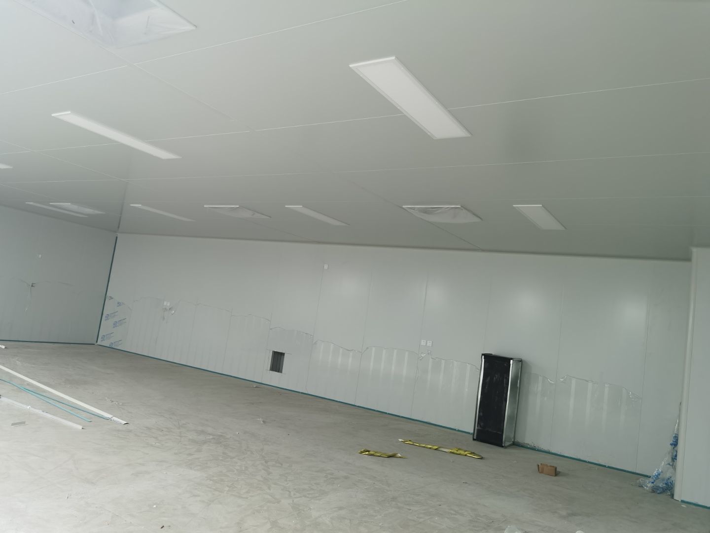 1,彩鋼墻板立板除預留設備外完成100% 2,彩鋼板吊頂除預留外,完成95% 3,三防板吊頂完成100% 4,水電安裝完成60% 5,彩鋼板收尾工作完成30%