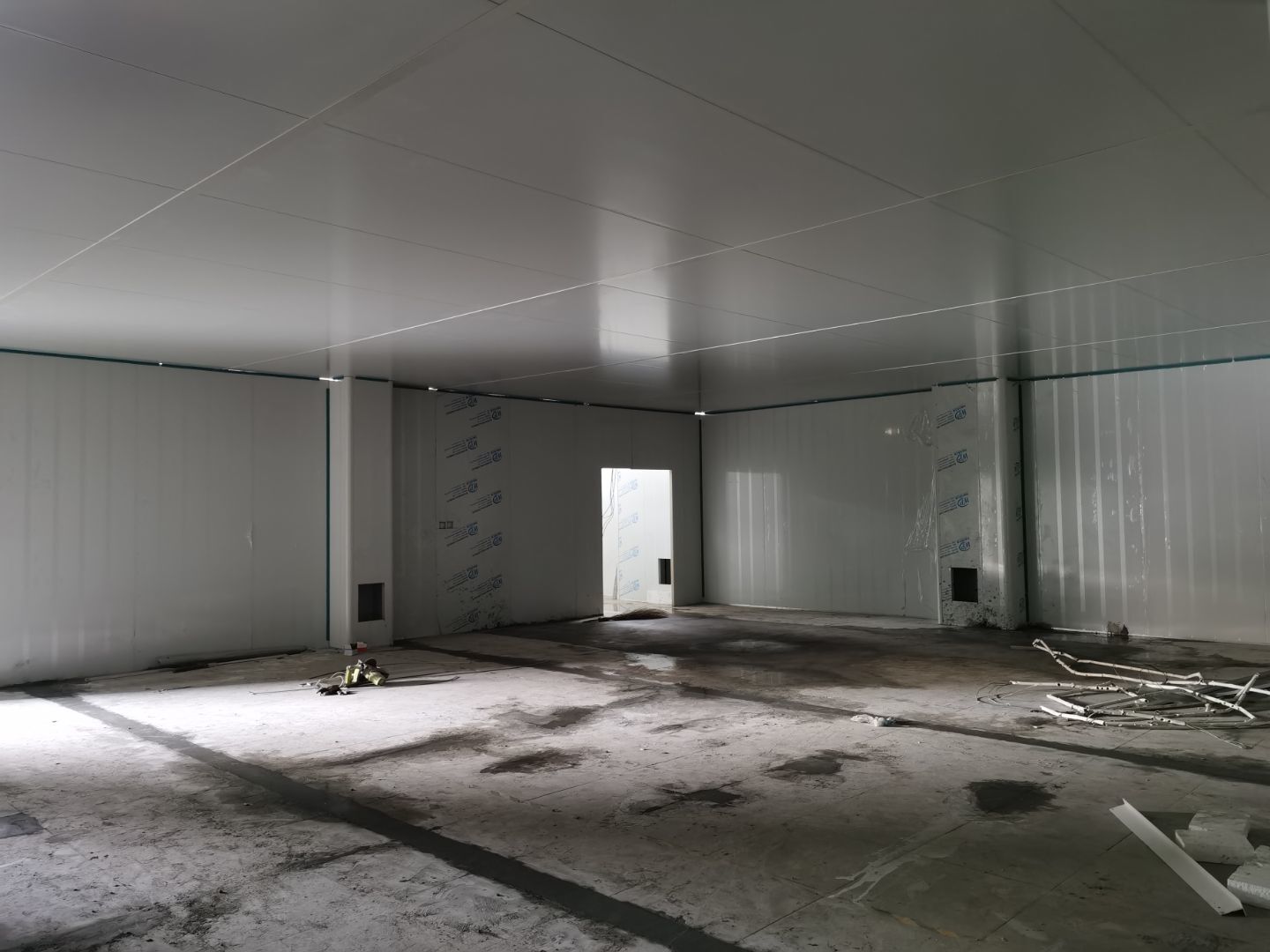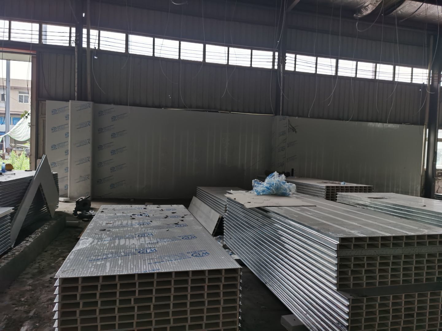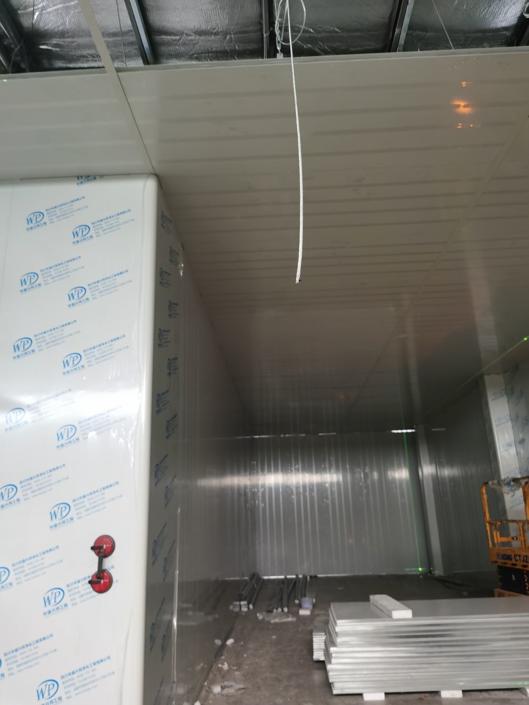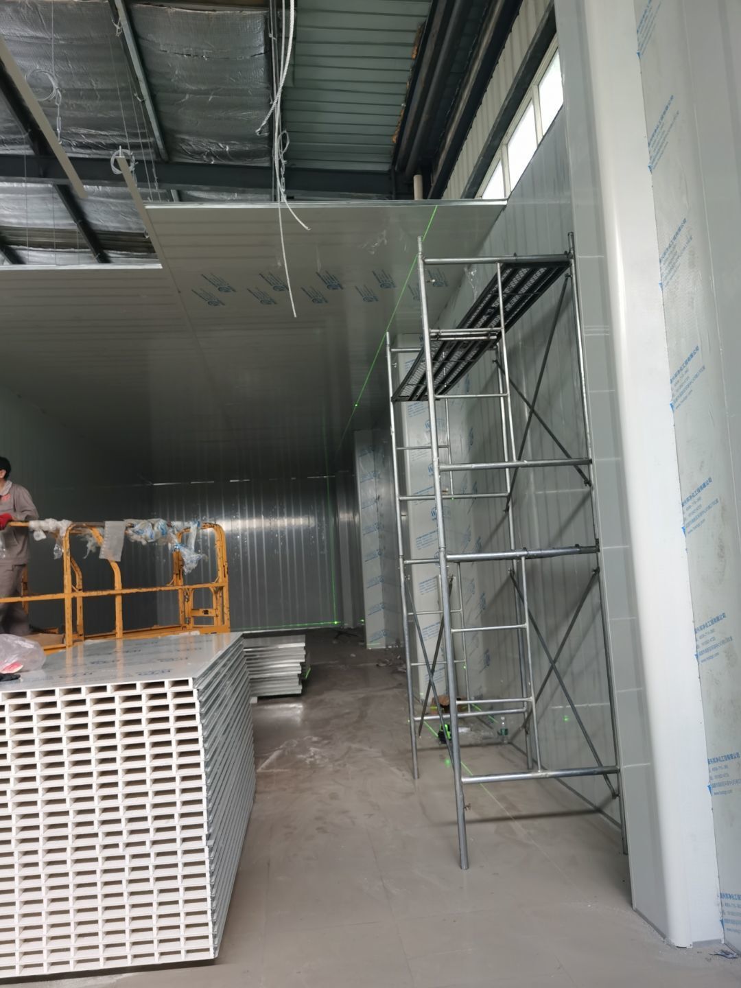 1,彩鋼墻板立板除預留設備外完成100% 2,彩鋼板吊頂除預留外,完成95% 3,三防板吊頂完成100% 4,水電安裝完成60% 5,彩鋼板收尾工作完成30%