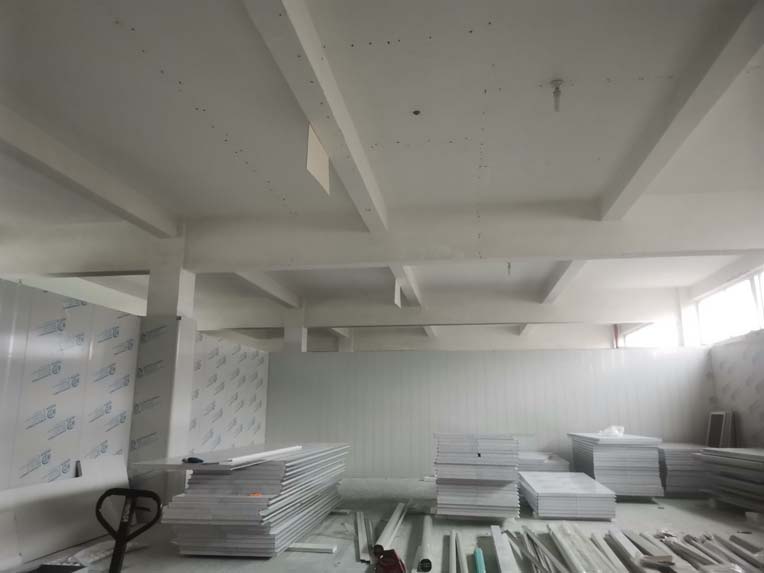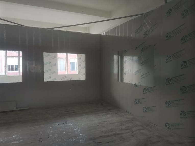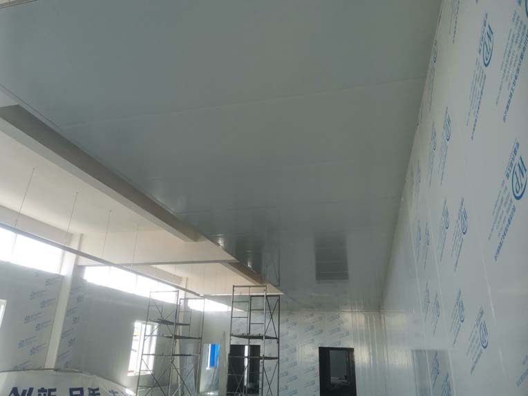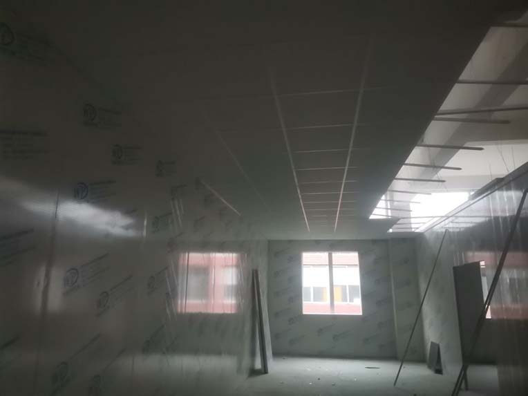 1.墻板安裝完成95%(因預留設備通道,待進場后實施; 2.地槽安裝完成95%; 3.頂板安裝完成80%; 4.彩鋼自制門安裝完成30%; 5.窗洞開設完成100%; 6.三防板吊頂完成20%; 7.水電安裝完成5%