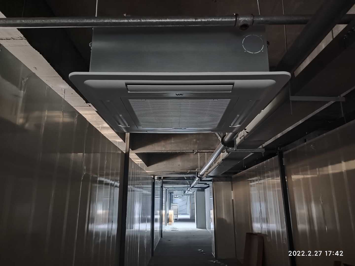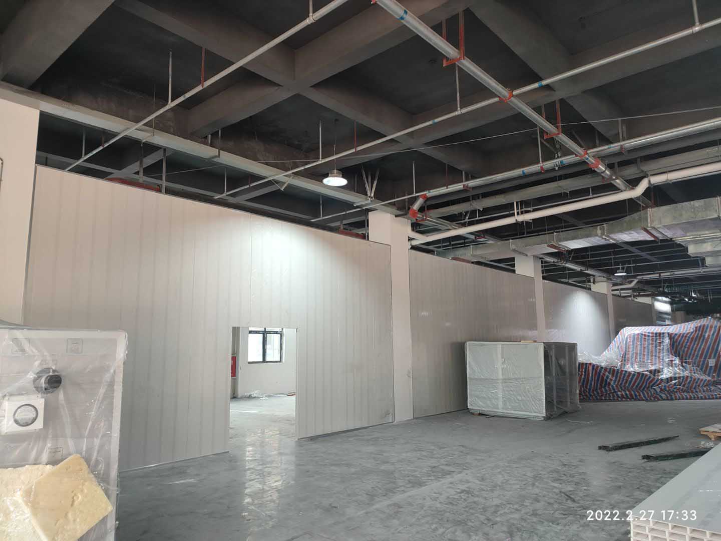 1,彩鋼板隔墻及吊頂完成95% 2,成品門安裝完成20% 3,空調模塊機組吊裝就位,配管完成30% 4,百葉風口安裝完成70%