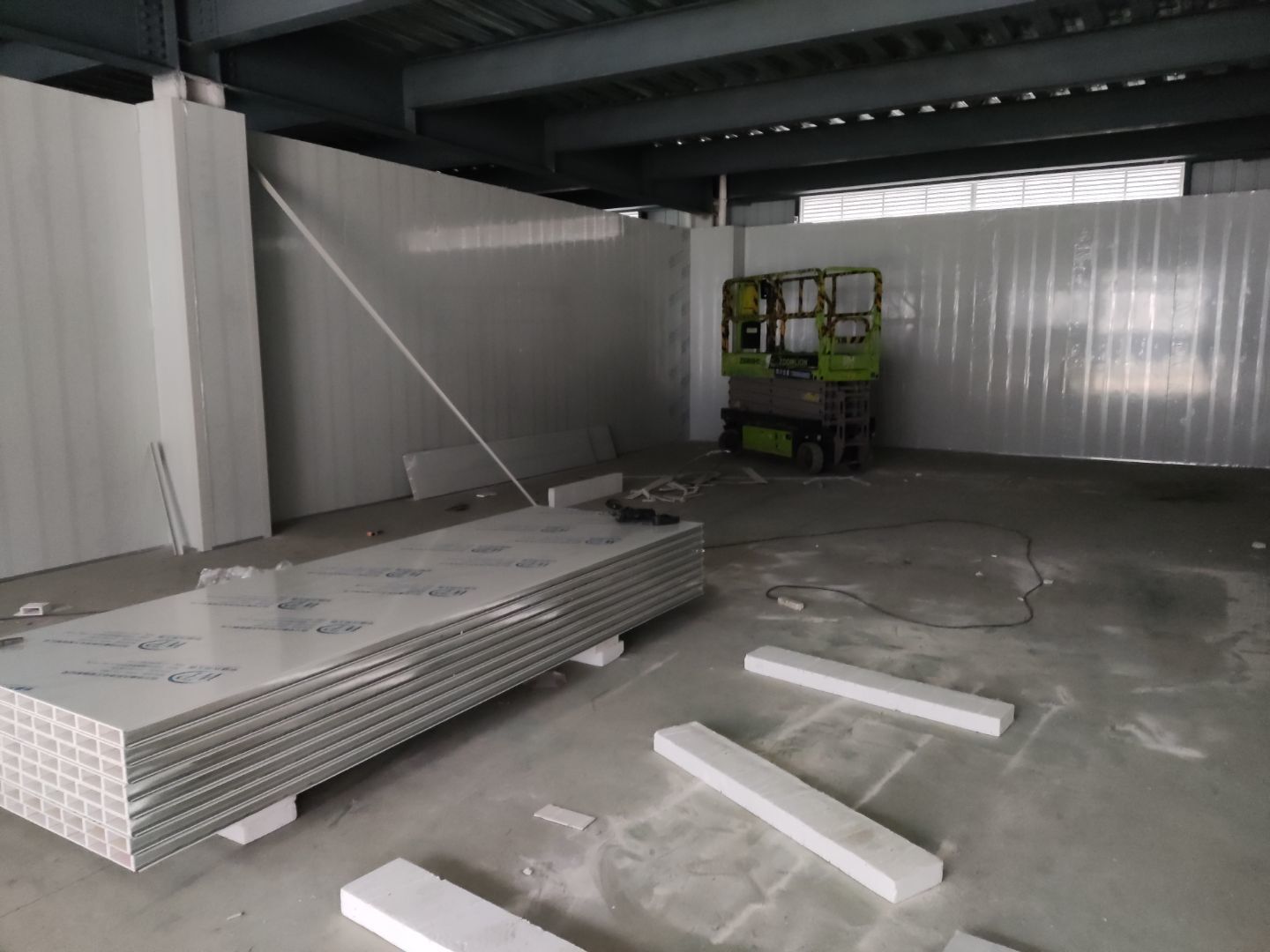一樓廁所地磚安裝完成50%,一樓辦公室地磚安裝完成20%;一樓生產區域墻板安裝完成65%,二樓吊裝口窗戶拆除完成。