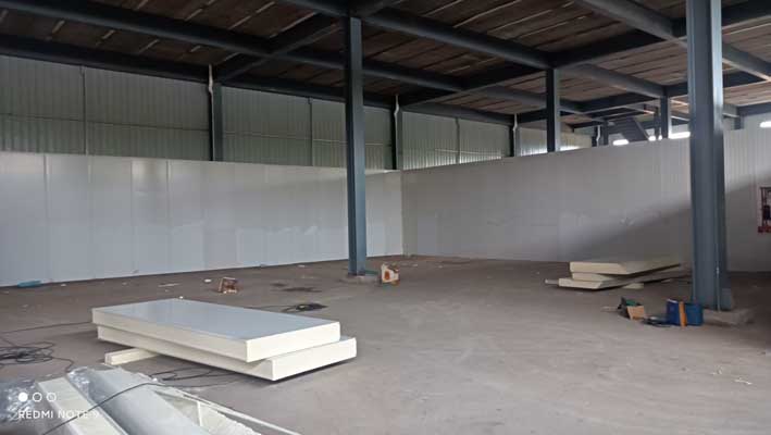 1,鋼材除銹刷漆。 2.原料庫板安裝,速凍庫板安裝,緩存間庫板安裝, 3.成品庫庫板安裝, 4.衛(wèi)生打掃, 三.材料進(jìn)場, 凍庫板到貨及輔材到貨,凍庫板安裝